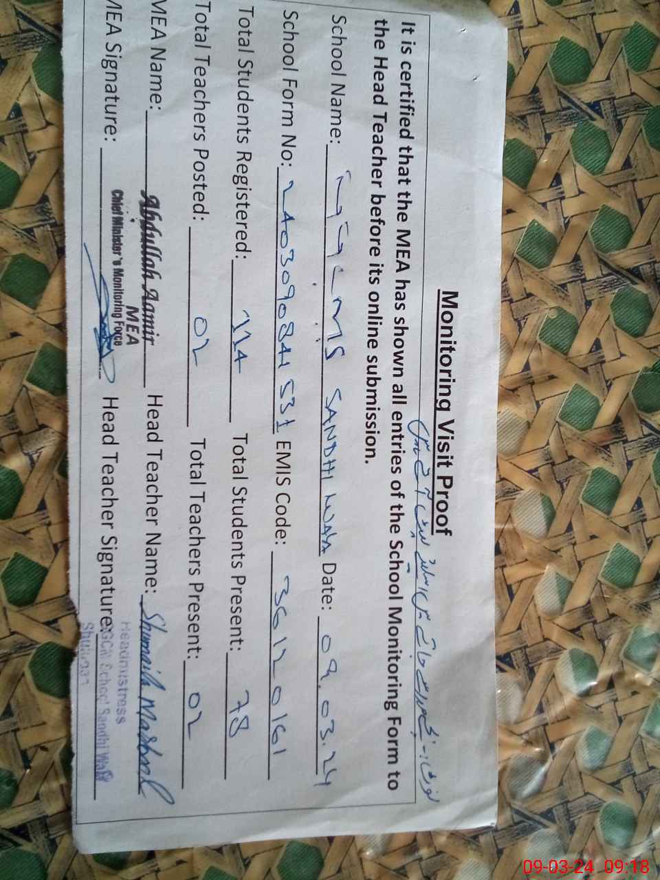 | Attendance Register | Head Teacher | MEA with School | Visit Proof |