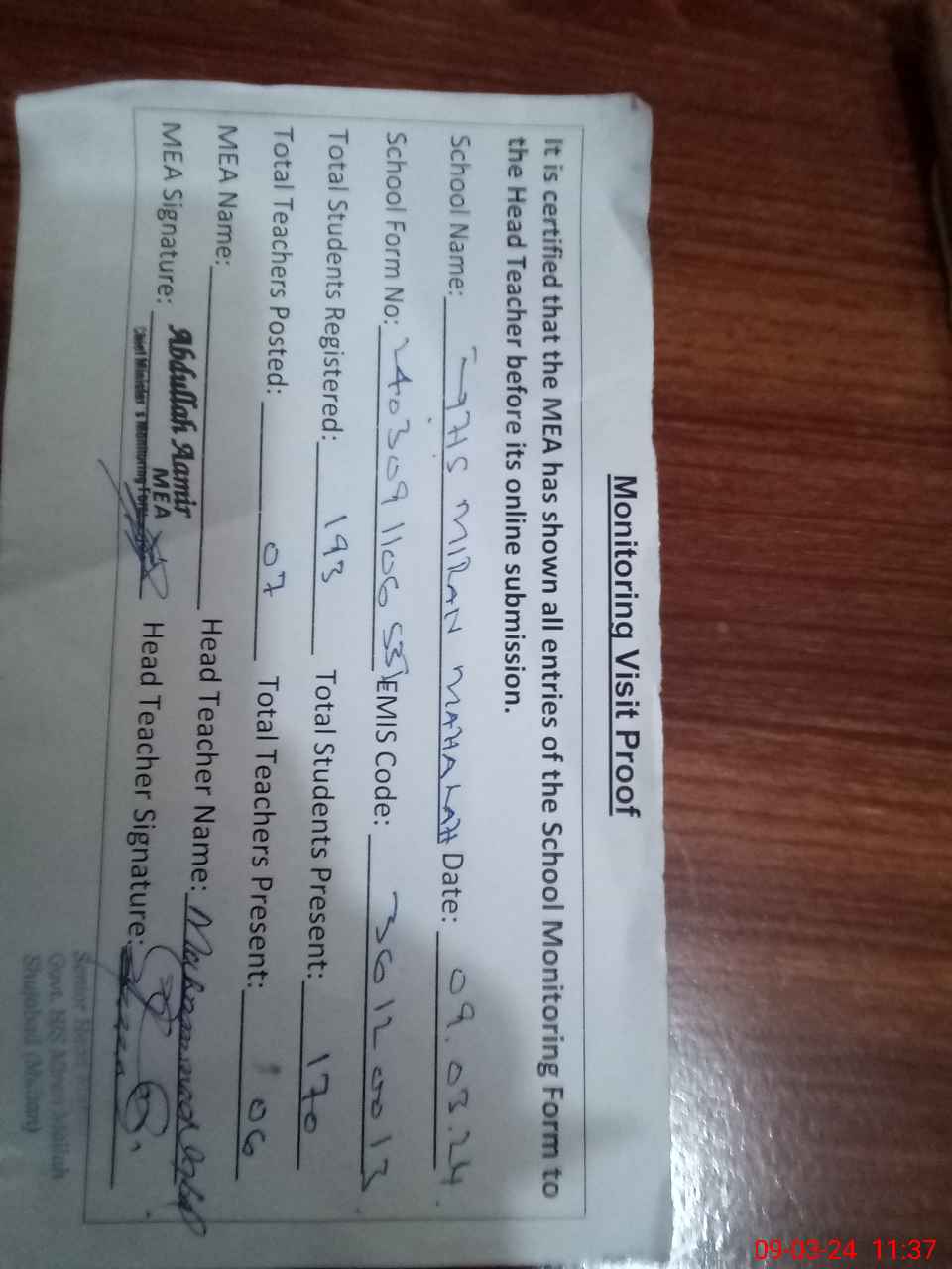 | Attendance Register | Head Teacher | MEA with School | Visit Proof |