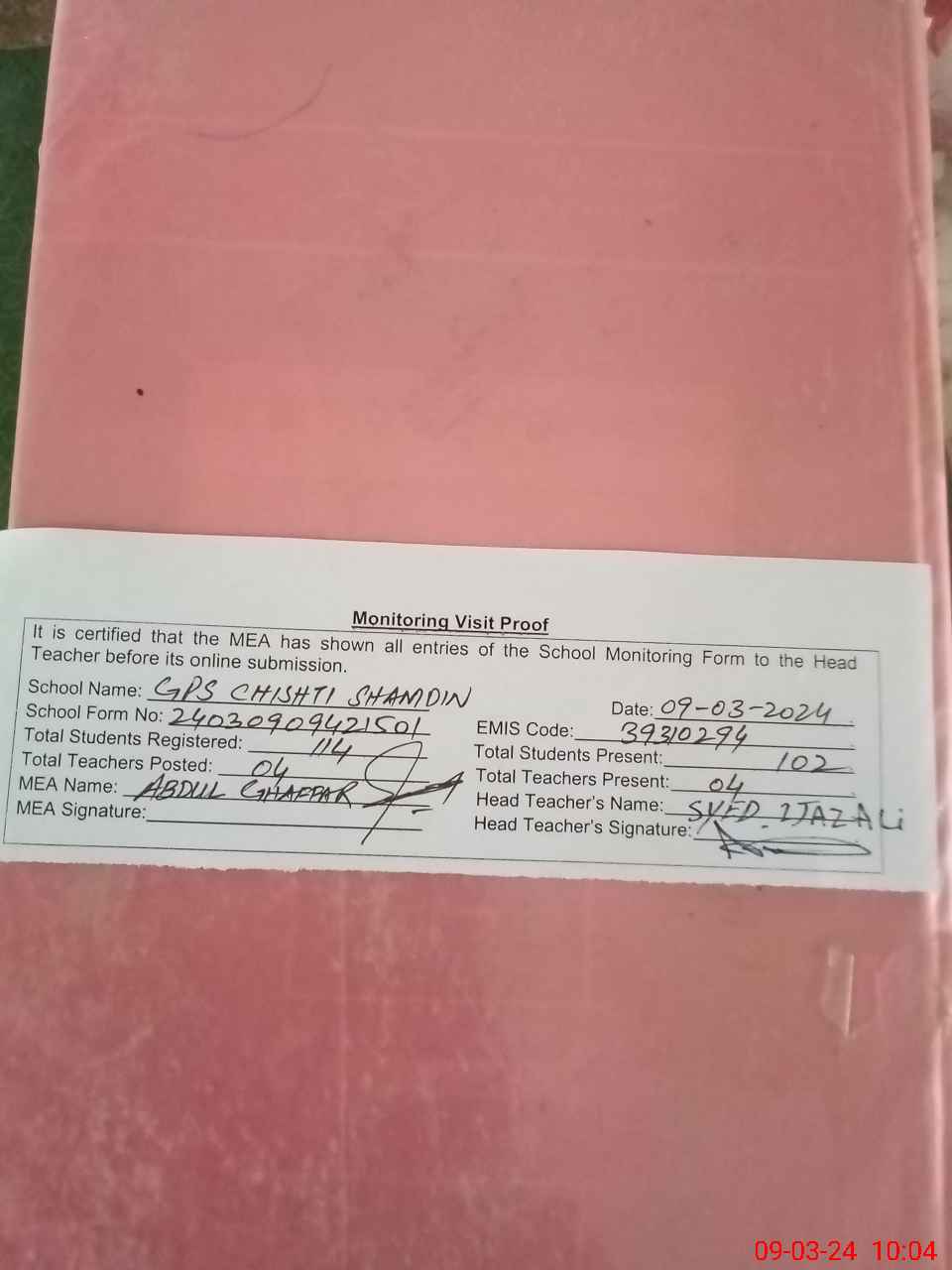 | Attendance Register | Head Teacher | MEA with School | Visit Proof |