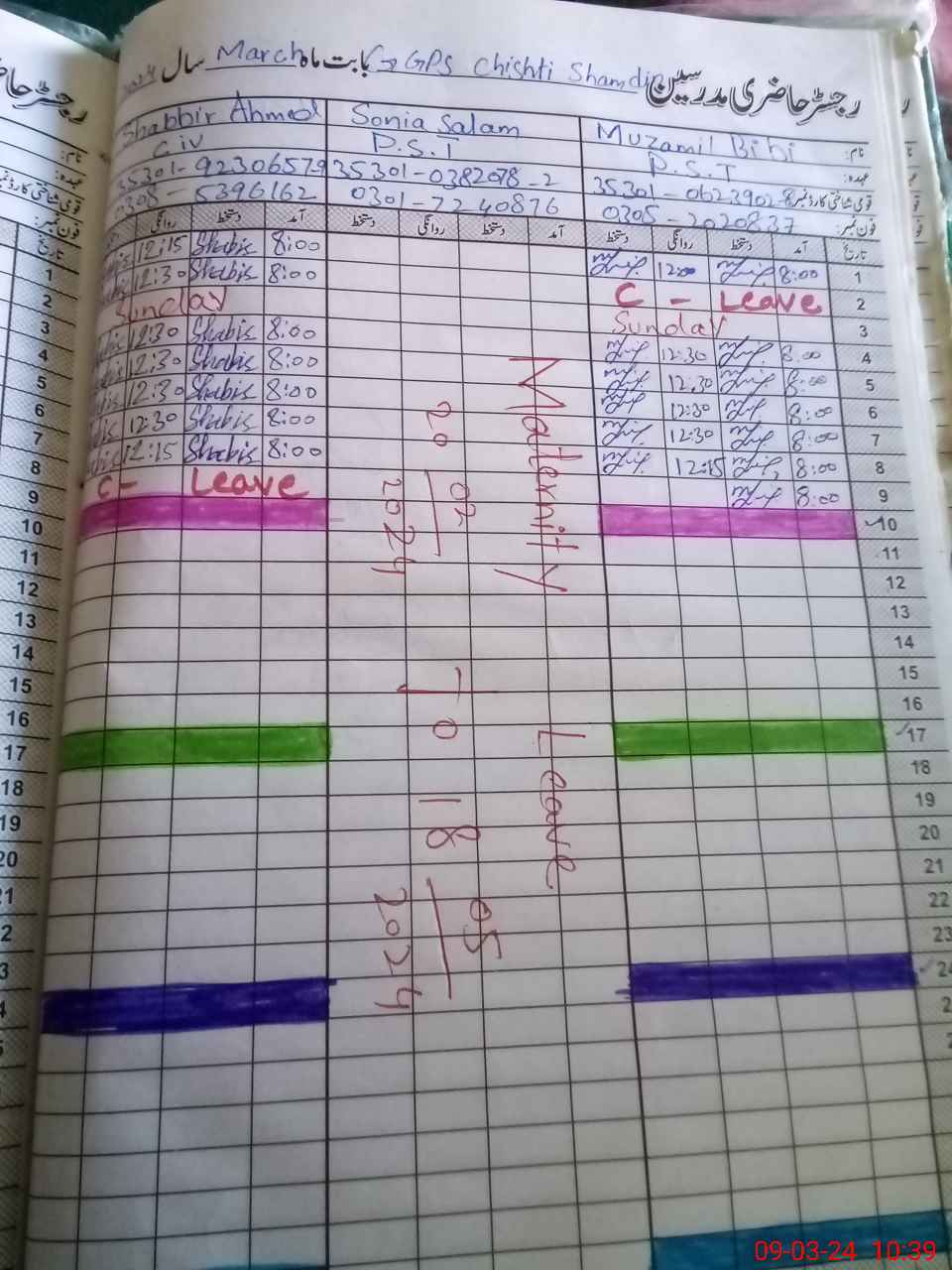 | Leave | Duty | Absent | Maternity | Medical | Ex- Pak |