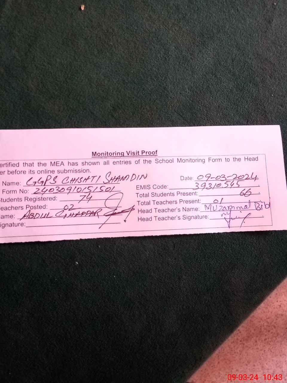 | Name: Mu**** Bi**** Designation: (School Headmaster's/Headmistress's) PST Phone/Cell Number: 03**** |