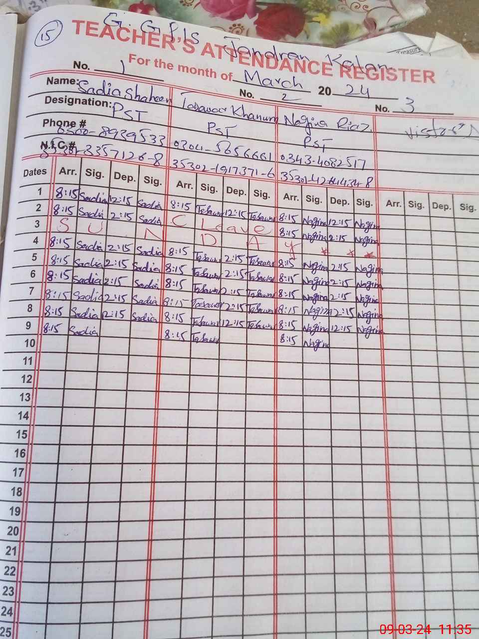 | Name: Sa**** Sh**** Designation: (School Headmaster's/Headmistress's) PST Phone/Cell Number: 03**** |