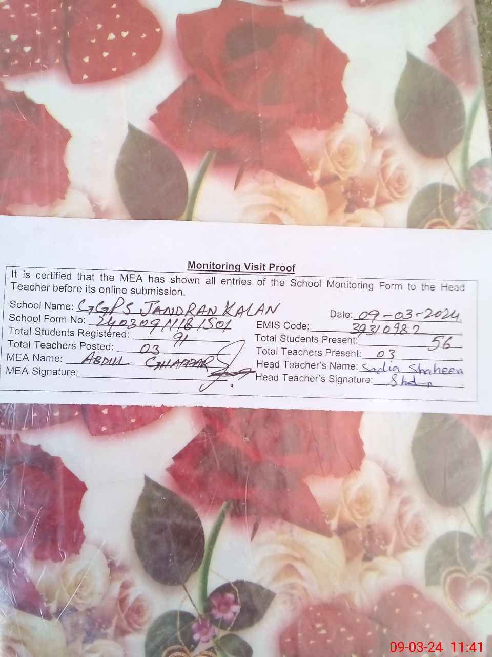| Attendance Register | Head Teacher | MEA with School | Visit Proof |