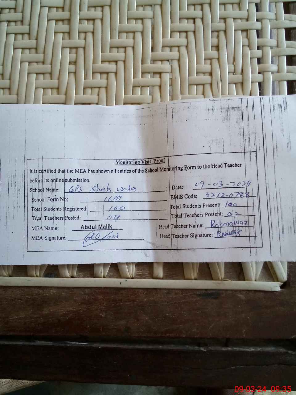 | EMIS Code: 32320788 | Name of School: GPS SHAH WALA | |||