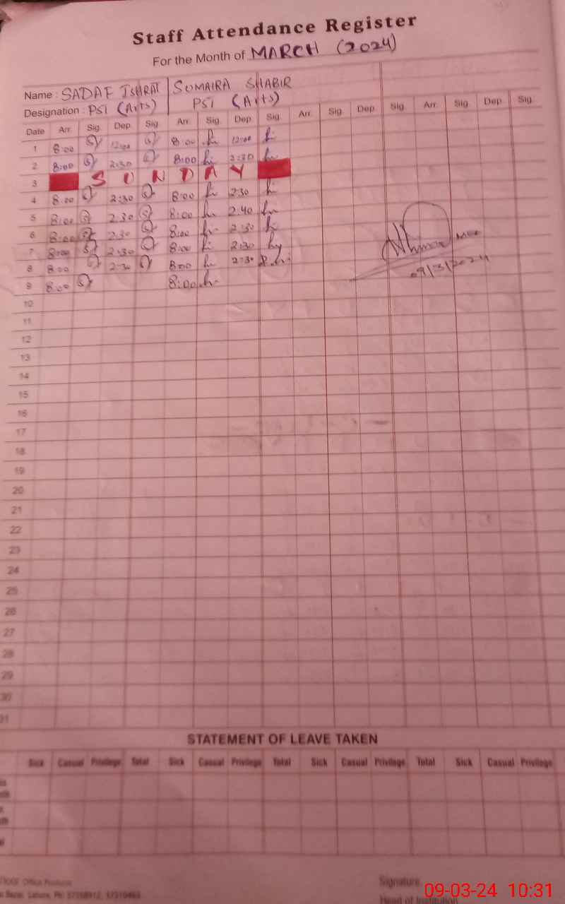 | Name: SA**** IS**** Designation: (School Headmaster's/Headmistress's) Headmistress Phone/Cell Number: 03**** |