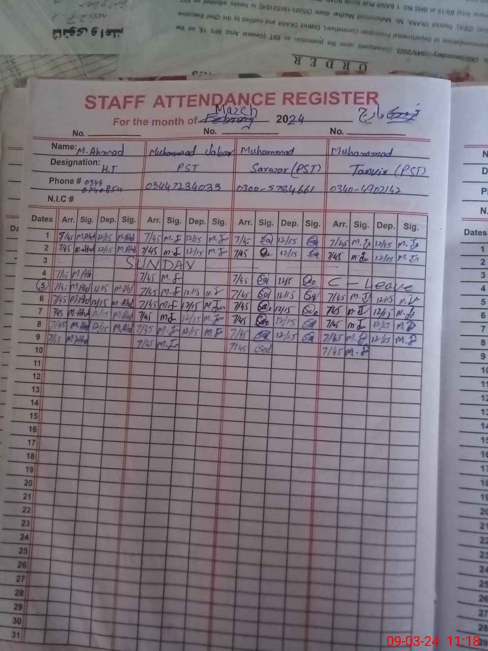 | CNIC | Full Name | Designation | R/C | Absence During Last Calender Month |