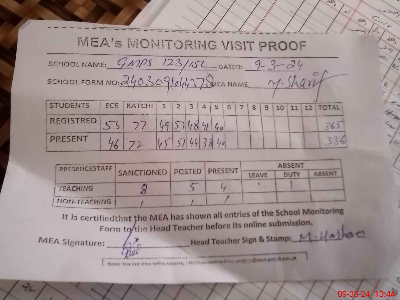 | Attendance Register | Head Teacher | MEA with School | Visit Proof |
