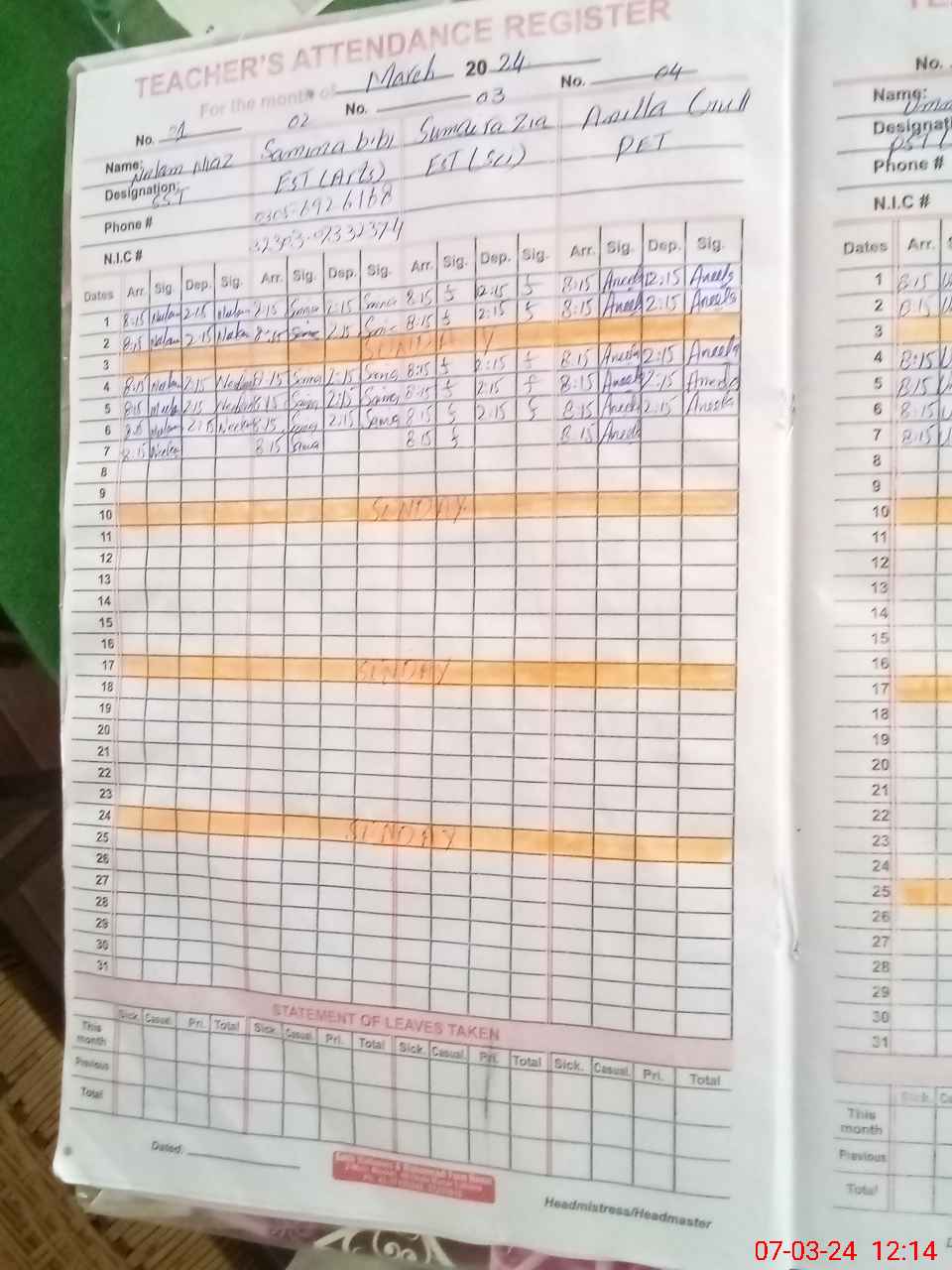 | CNIC | Full Name | Designation | R/C | Absence During Last Calender Month |