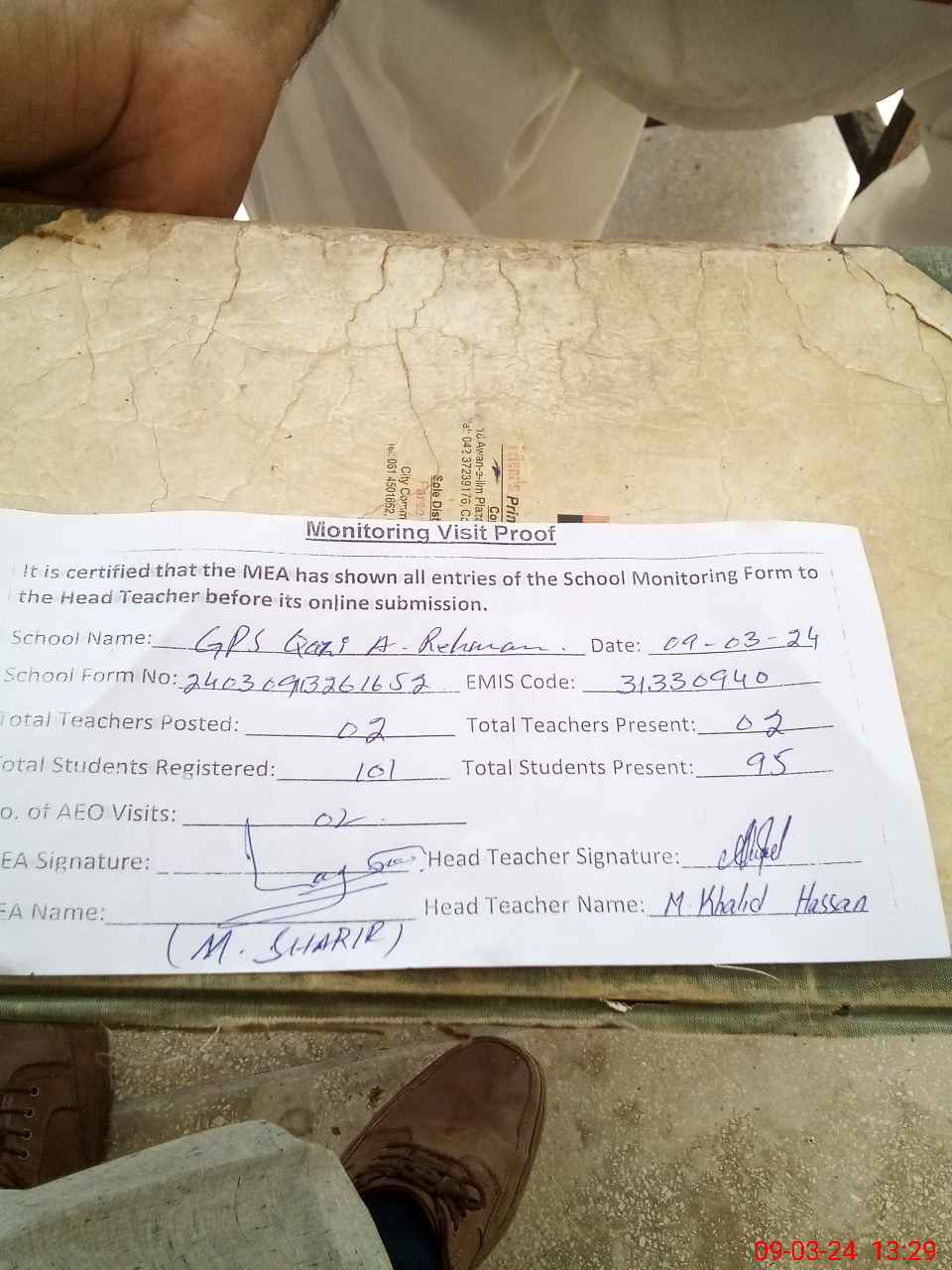 | Attendance Register | Head Teacher | MEA with School | Visit Proof |