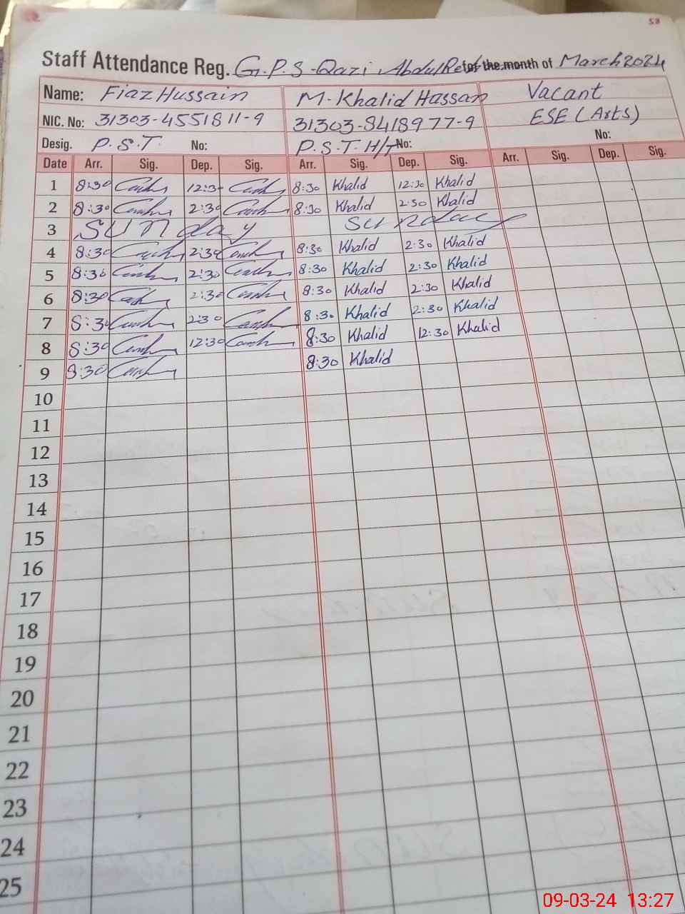 | CNIC | Full Name | Designation | R/C | Absence During Last Calender Month |