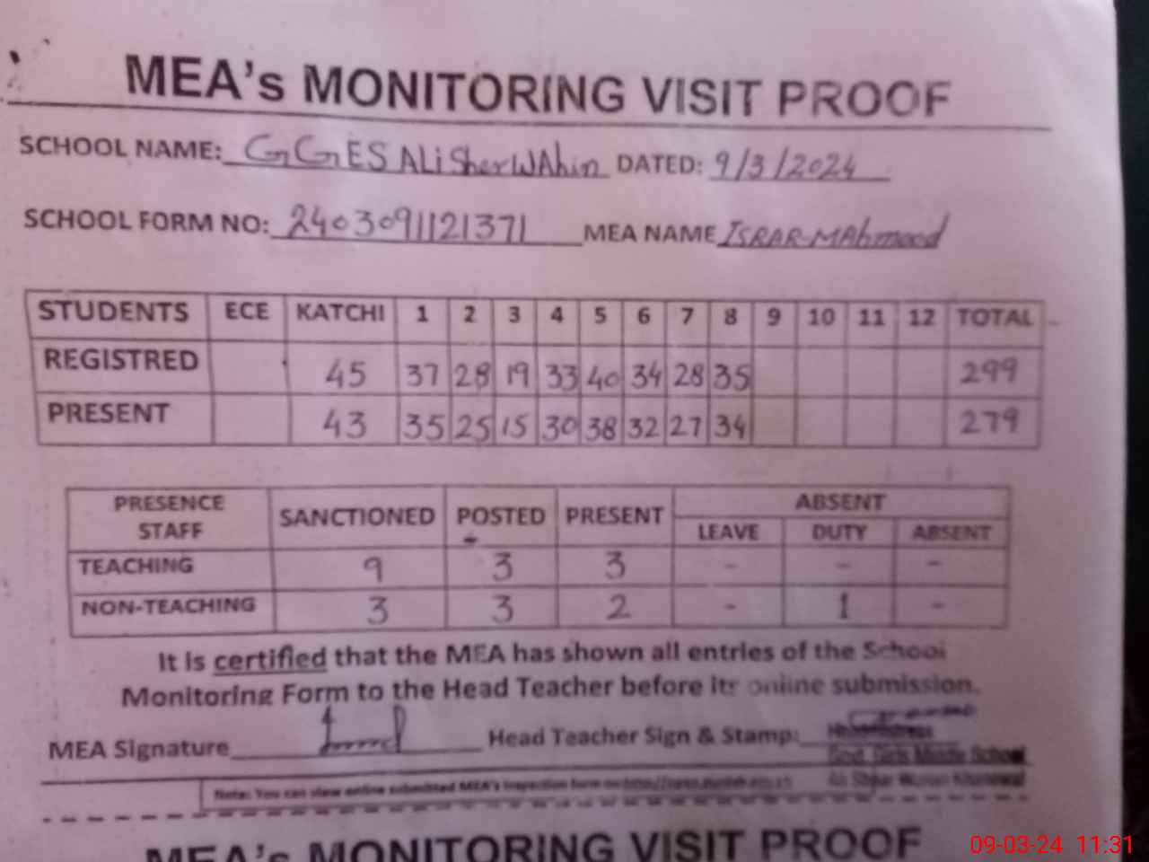 | Attendance Register | Head Teacher | MEA with School | Visit Proof |