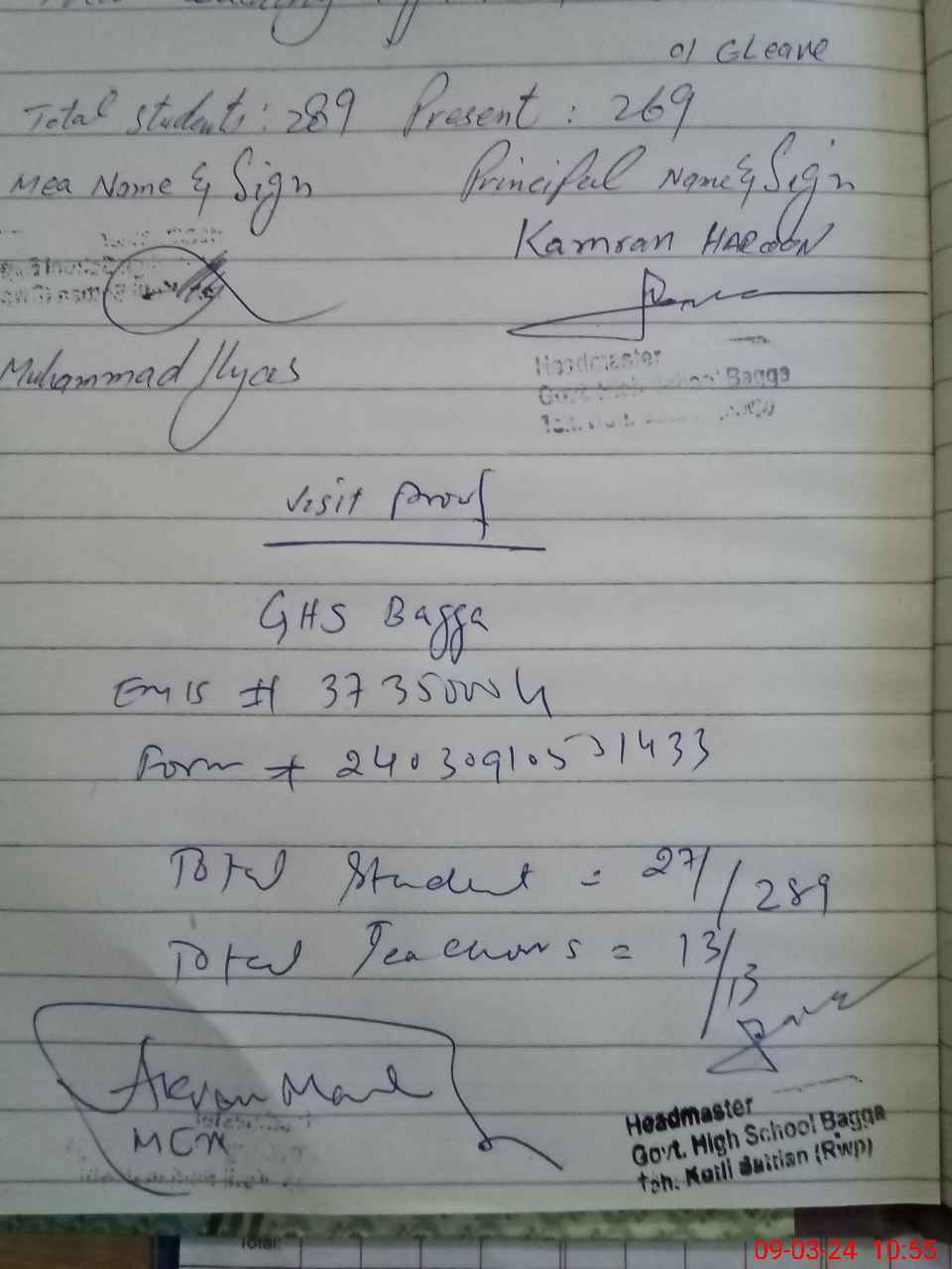 | Attendance Register | Head Teacher | MEA with School | Visit Proof |