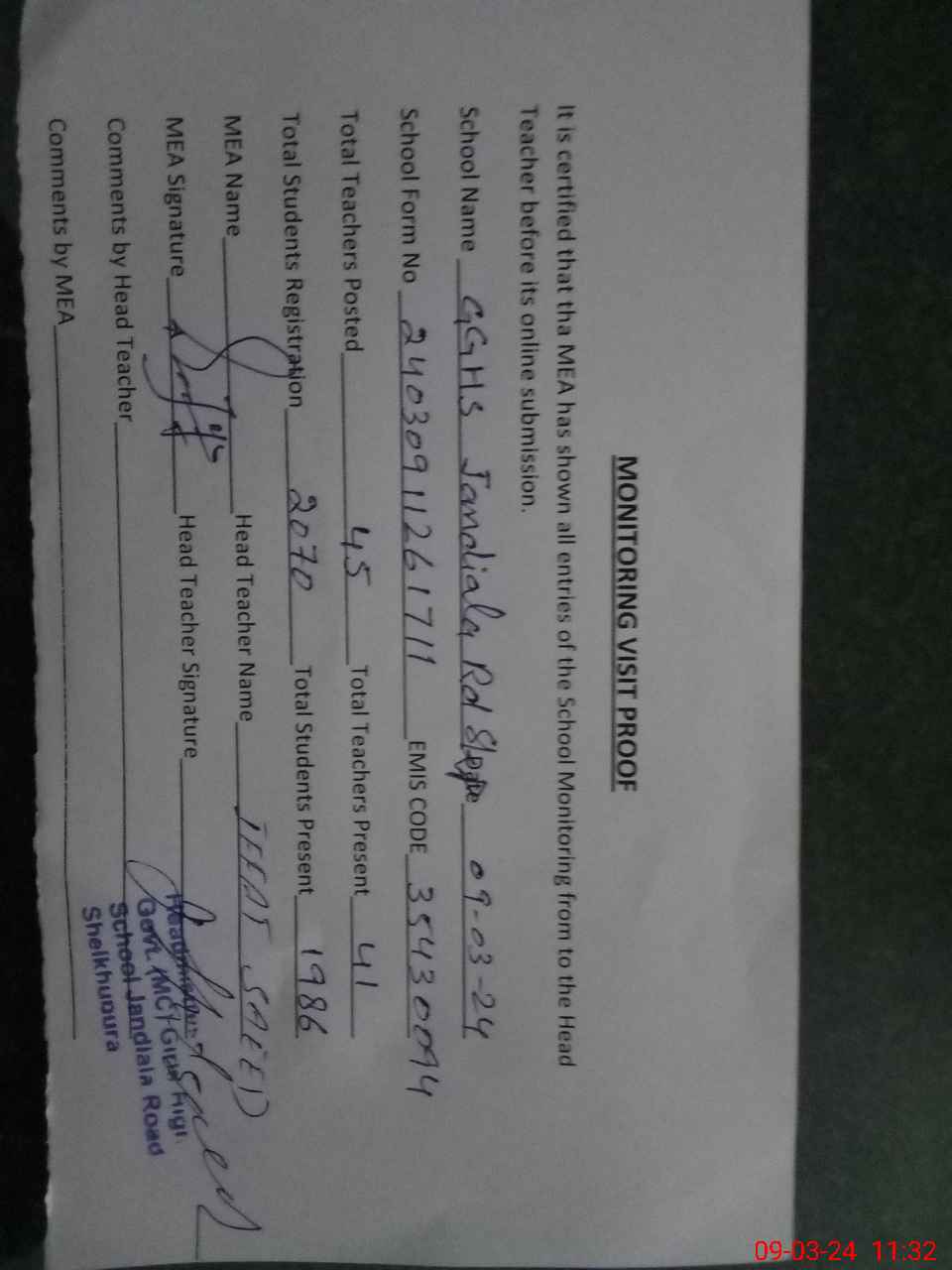 | Certified that this School was Inspected by the Undersigned MEA/DMO Today and the Information Stated Above is as Per Record. | |||||