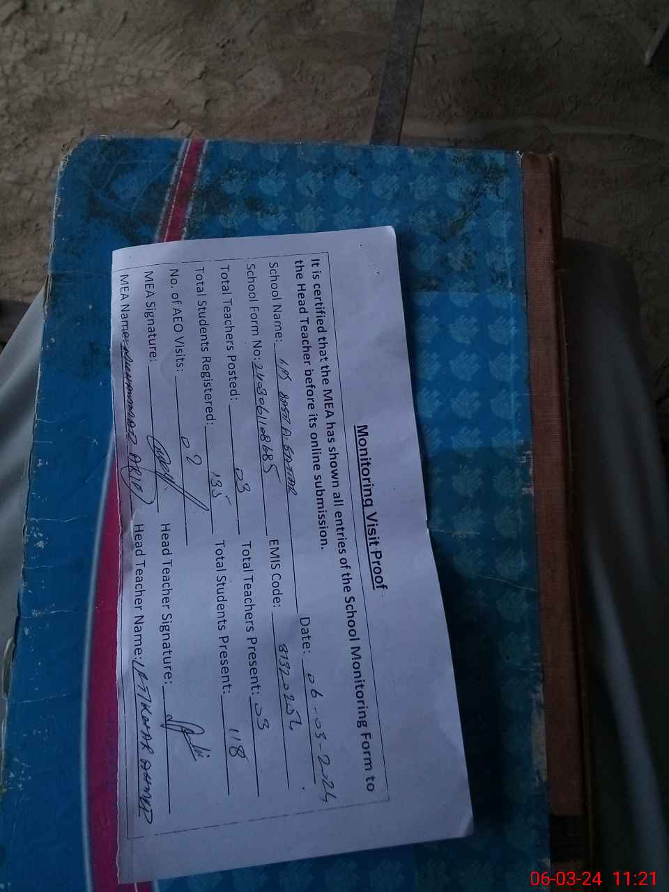 | Attendance Register | Head Teacher | MEA with School | Visit Proof |
