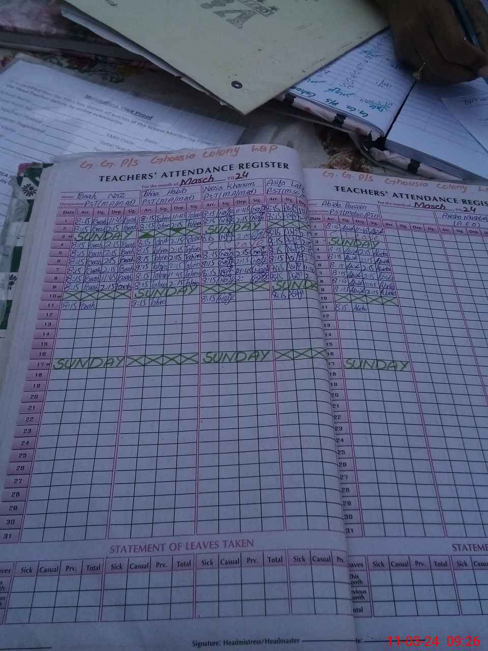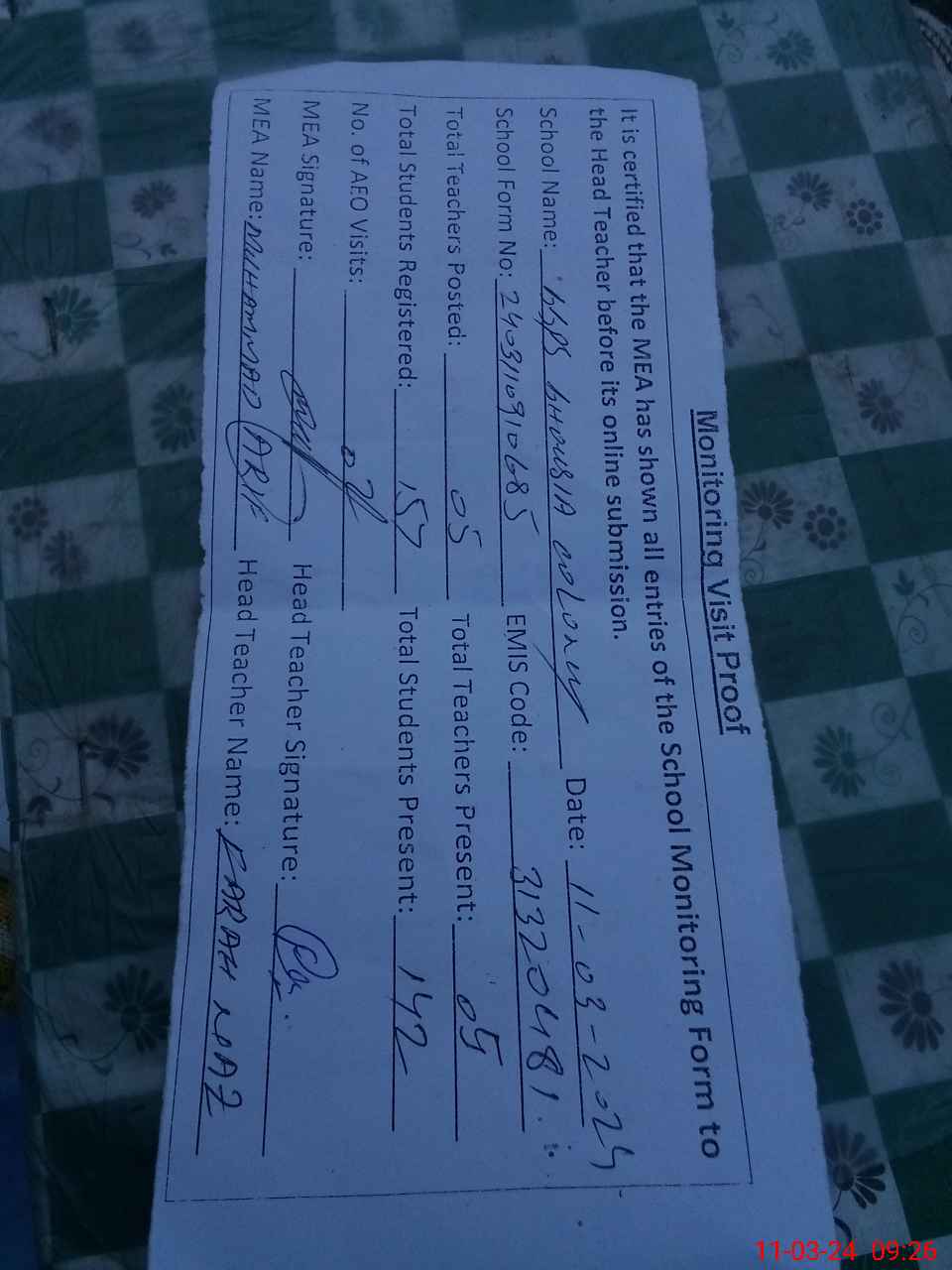 | Attendance Register | Head Teacher | MEA with School | Visit Proof |