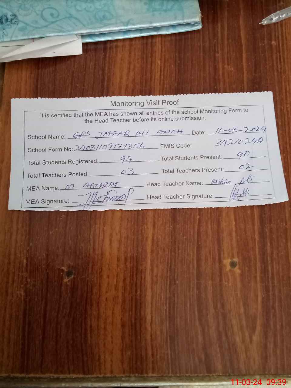 | Attendance Register | Head Teacher | MEA with School | Visit Proof |