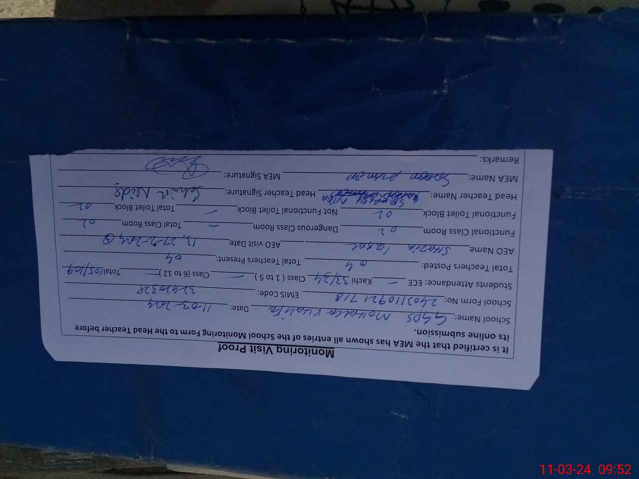 | Monitoring Date: 11-03-2024 | Start Time: 11-03-2024 09:20 AM | End Time: 11-03-2024 09:55 AM | Name of MEA: Sa**** Ah**** | |