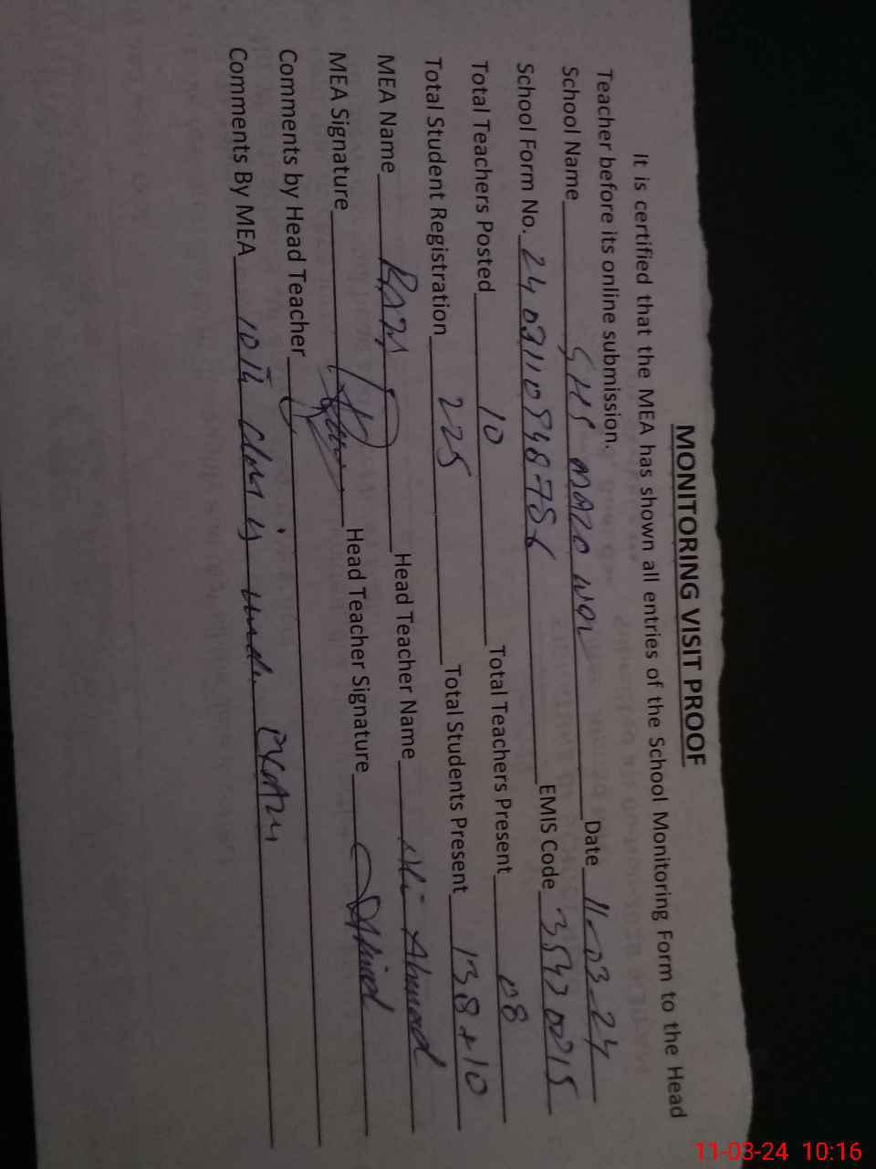 | Attendance Register | Head Teacher | MEA with School | Visit Proof |