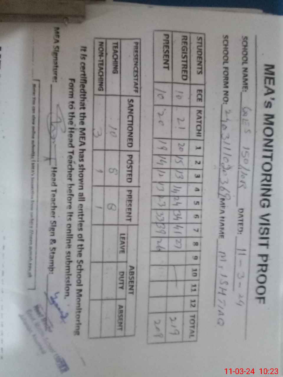 | Attendance Register | Head Teacher | MEA with School | Visit Proof |
