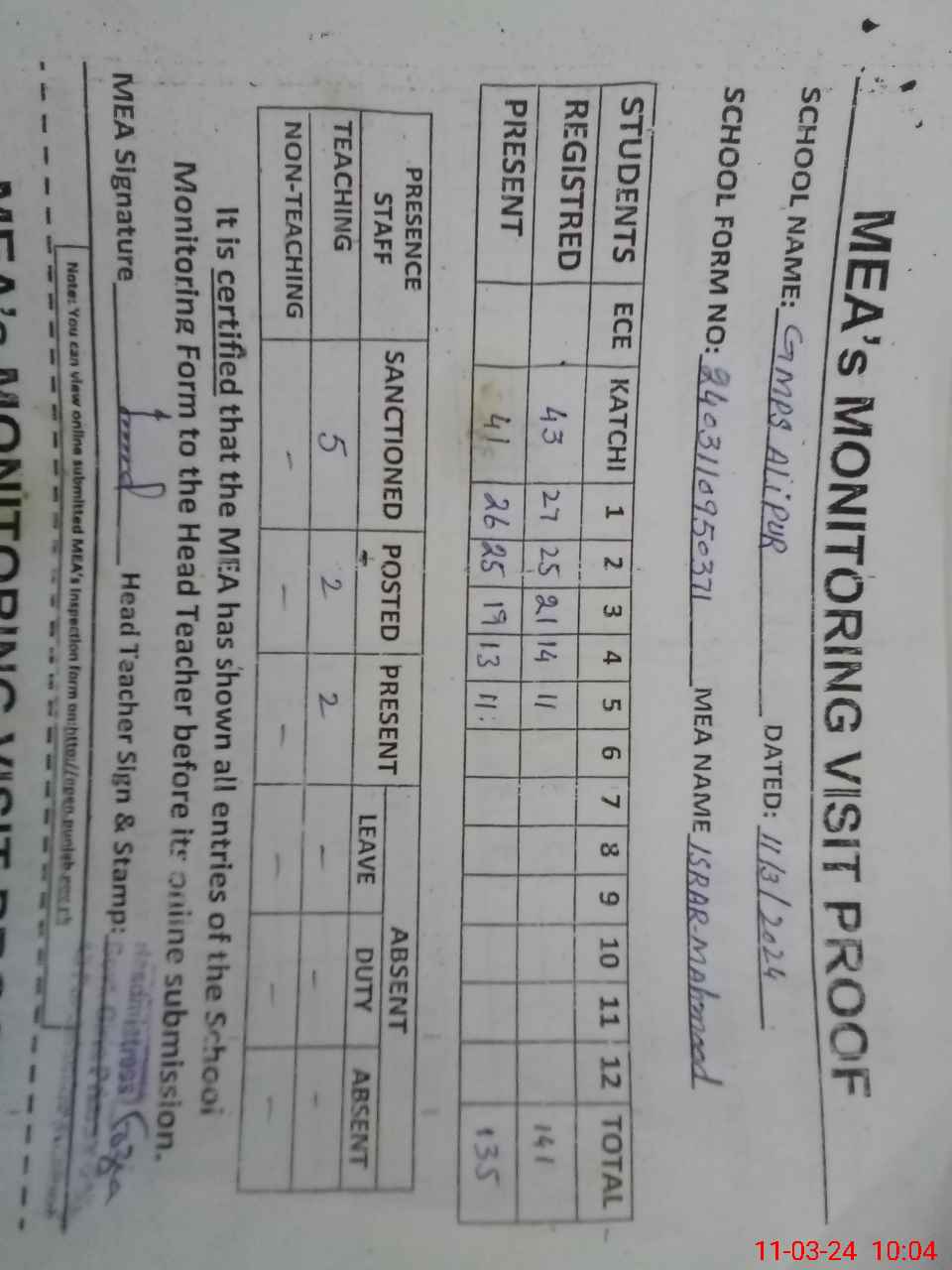 | Certified that this School was Inspected by the Undersigned MEA/DMO Today and the Information Stated Above is as Per Record. | |||||