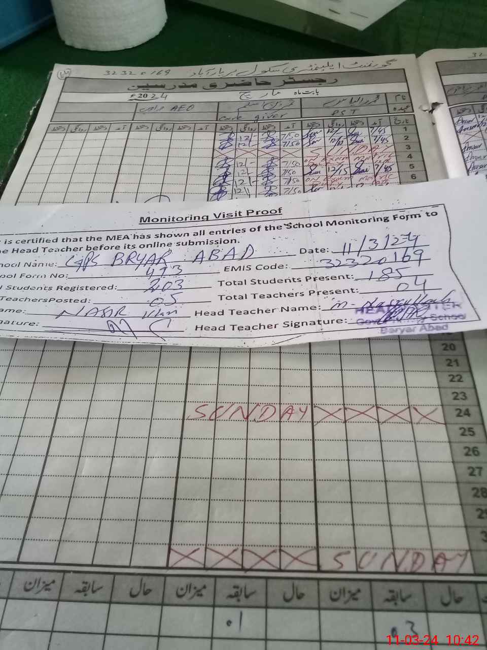 | Attendance Register | Head Teacher | MEA with School | Visit Proof |