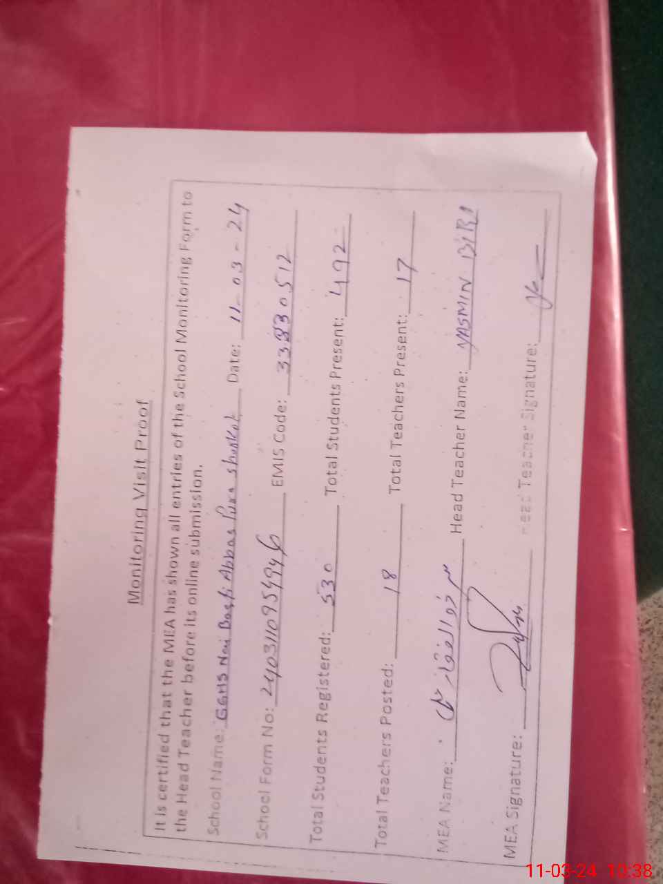 | Attendance Register | Head Teacher | MEA with School | Visit Proof |