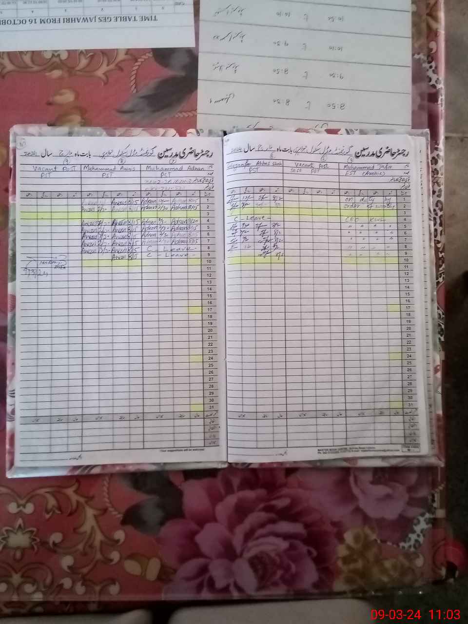 | CNIC | Full Name | Designation | R/C | Absence During Last Calender Month |