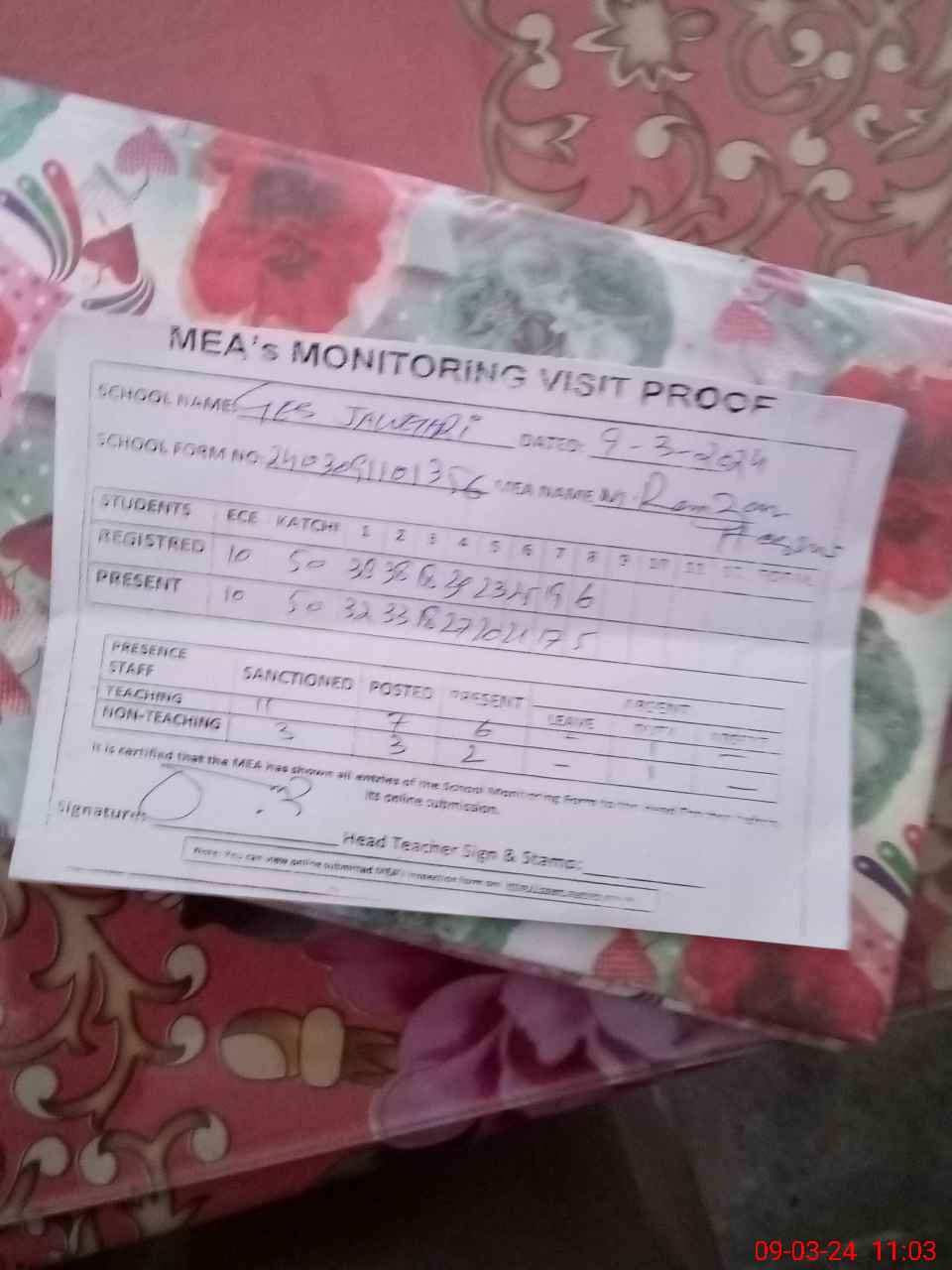 | Attendance Register | Head Teacher | MEA with School | Visit Proof |