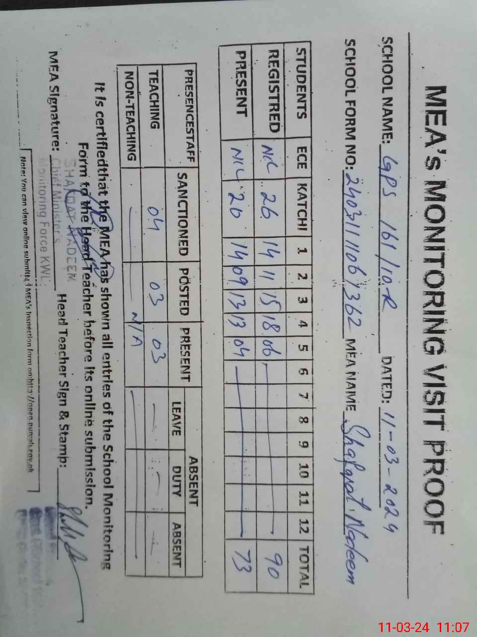 | Attendance Register | Head Teacher | MEA with School | Visit Proof |