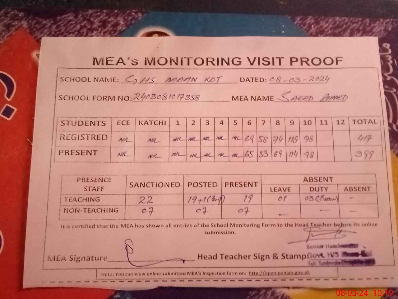 | Certified that this School was Inspected by the Undersigned MEA/DMO Today and the Information Stated Above is as Per Record. | |||||