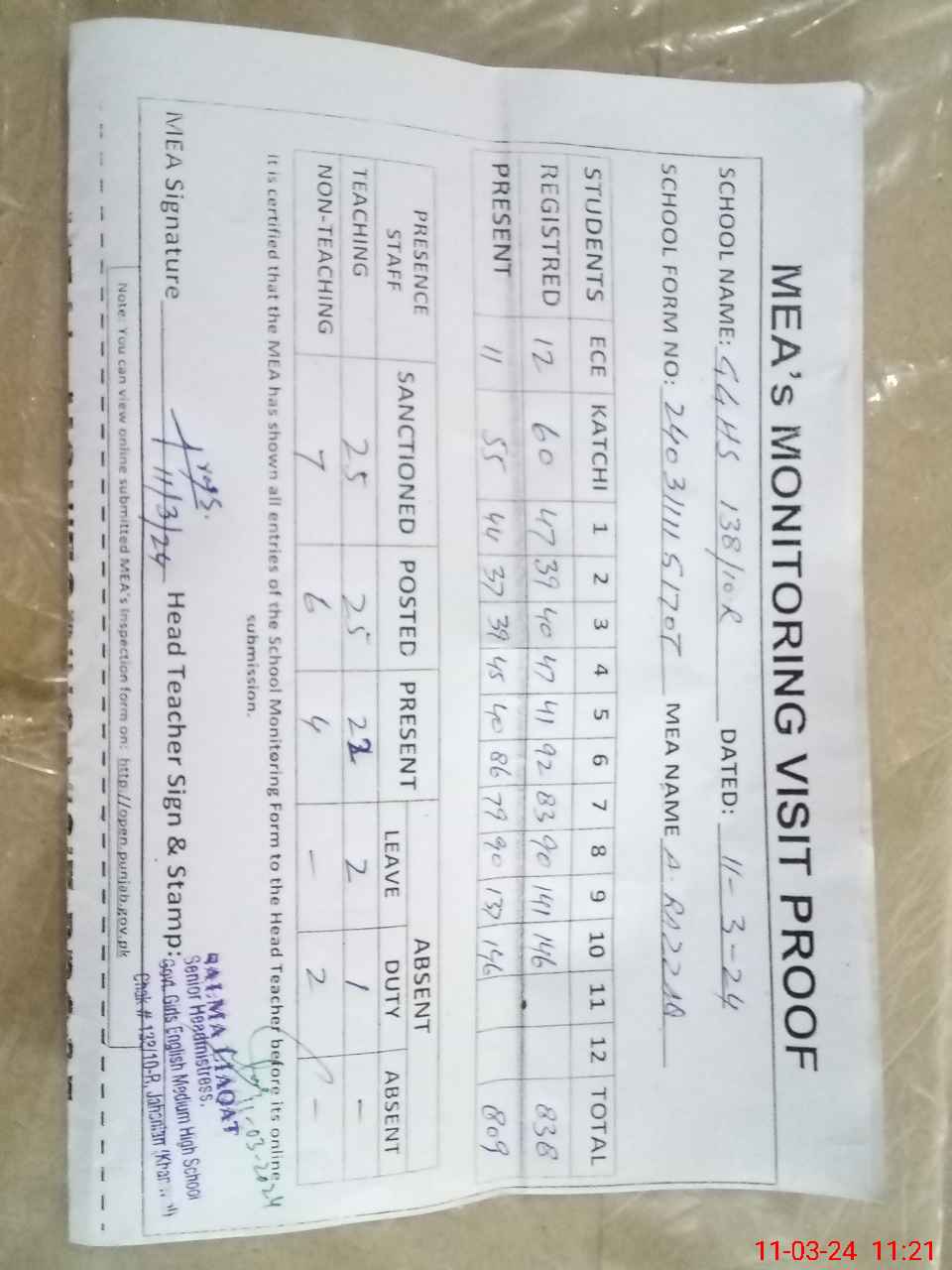| Attendance Register | Head Teacher | MEA with School | Visit Proof |