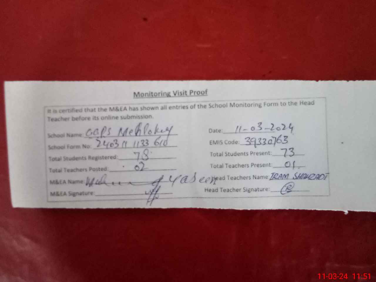 | EMIS Code: 39330763 | Name of School: GGPS MEHLOO KE | |||