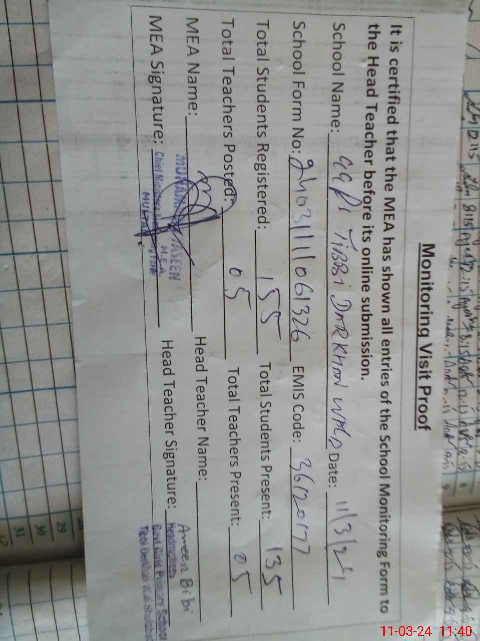 | Attendance Register | Head Teacher | MEA with School | Visit Proof |