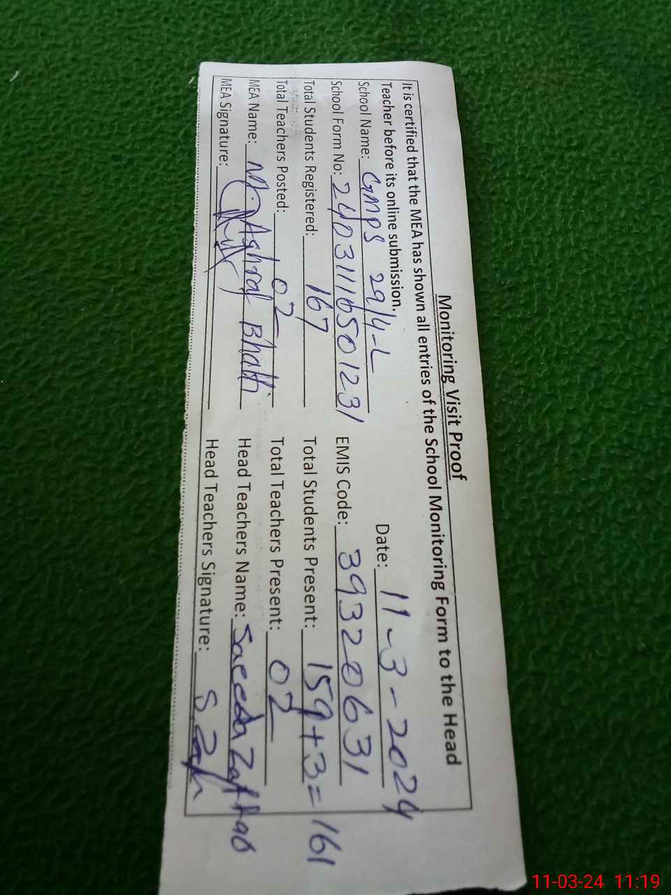 | Certified that this School was Inspected by the Undersigned MEA/DMO Today and the Information Stated Above is as Per Record. | |||||