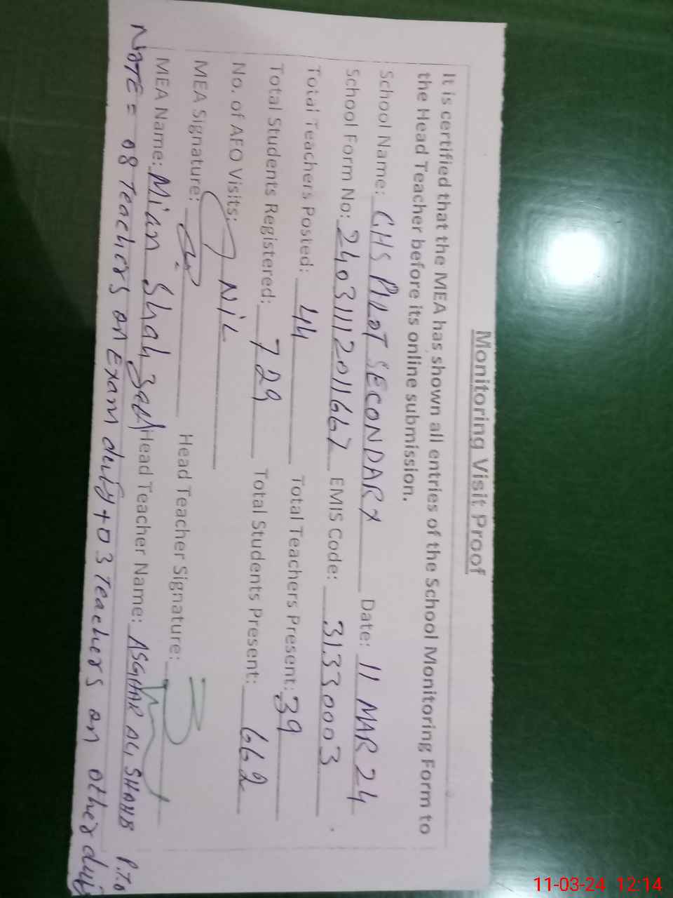 | Certified that this School was Inspected by the Undersigned MEA/DMO Today and the Information Stated Above is as Per Record. | |||||