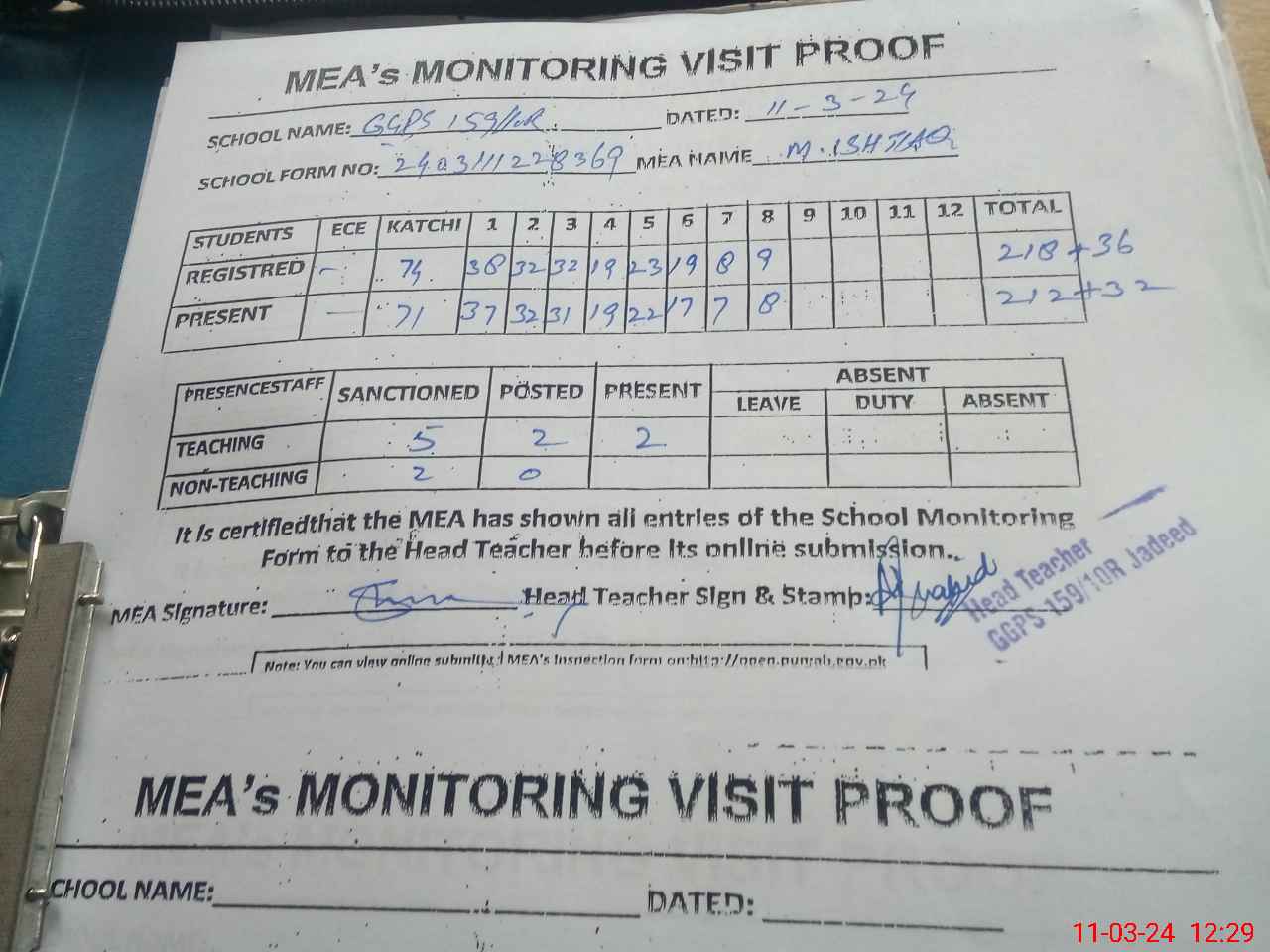 | Attendance Register | Head Teacher | MEA with School | Visit Proof |