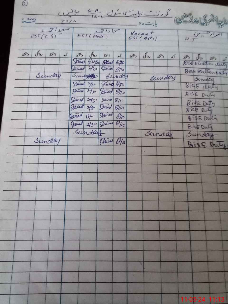 | 36**** | Mu**** Sa**** | Regular | 0 | 29 | 0 | 0 | 0 | 0 | 0 | 0 | 0 | Exam Duty | |