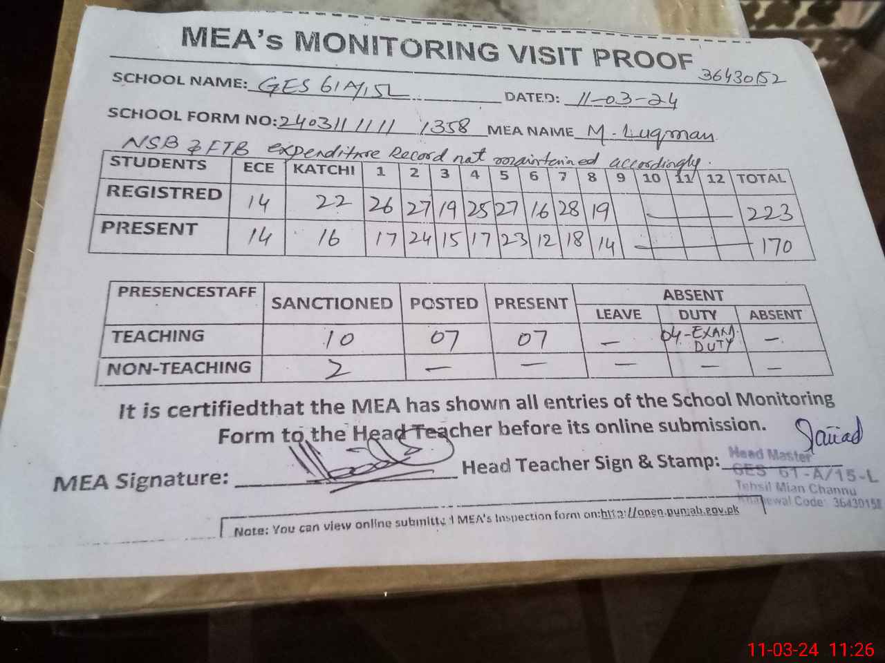 | Attendance Register | Head Teacher | MEA with School | Visit Proof |