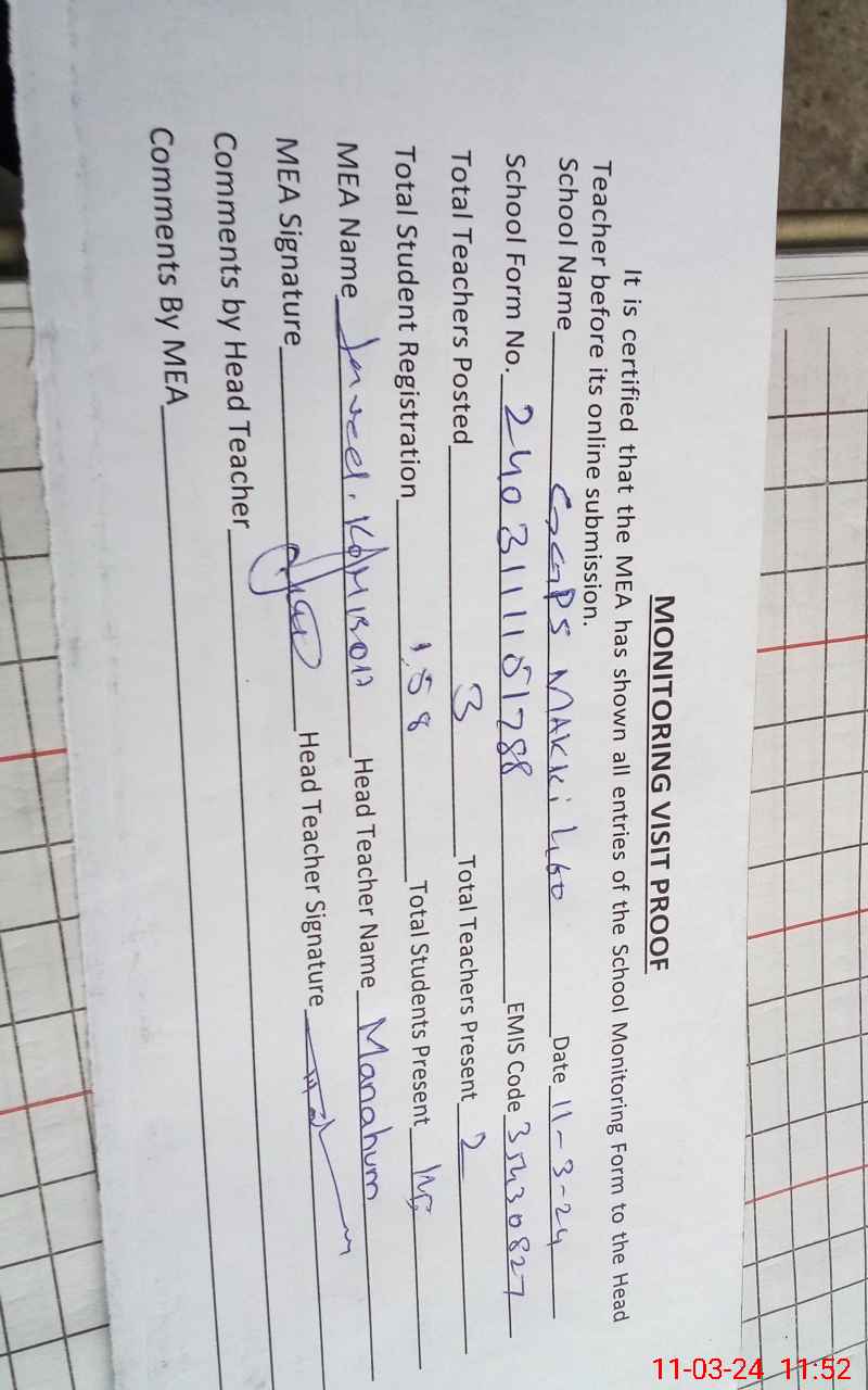 | Attendance Register | Head Teacher | MEA with School | Visit Proof |