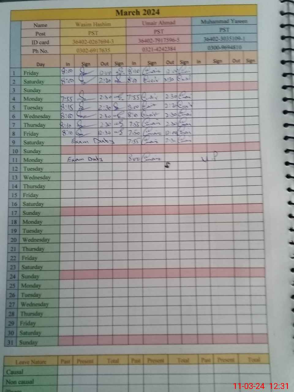 | 36**** | Mu**** Wa**** Ha**** | PST | Regular | 0 | 2 | 0 | 0 | 0 | 0 | 0 | 0 | 0 | Exam Duty |