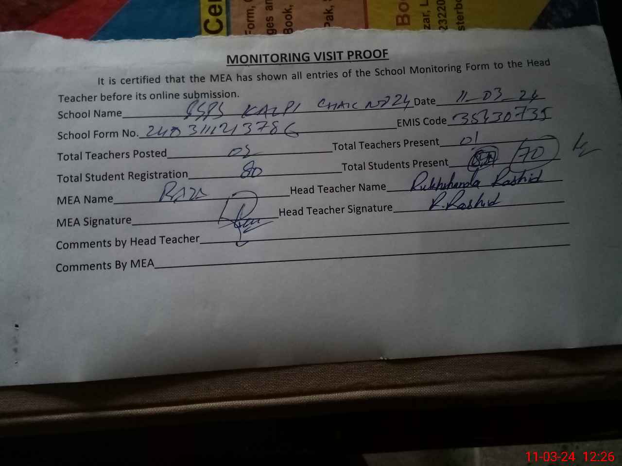 | Attendance Register | Head Teacher | MEA with School | Visit Proof |