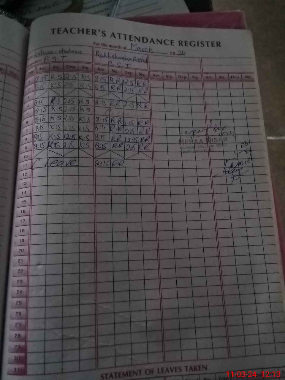 Leave Type | Remarks for today (Leave,Training, Exam,Absent,Late, Other duty) |