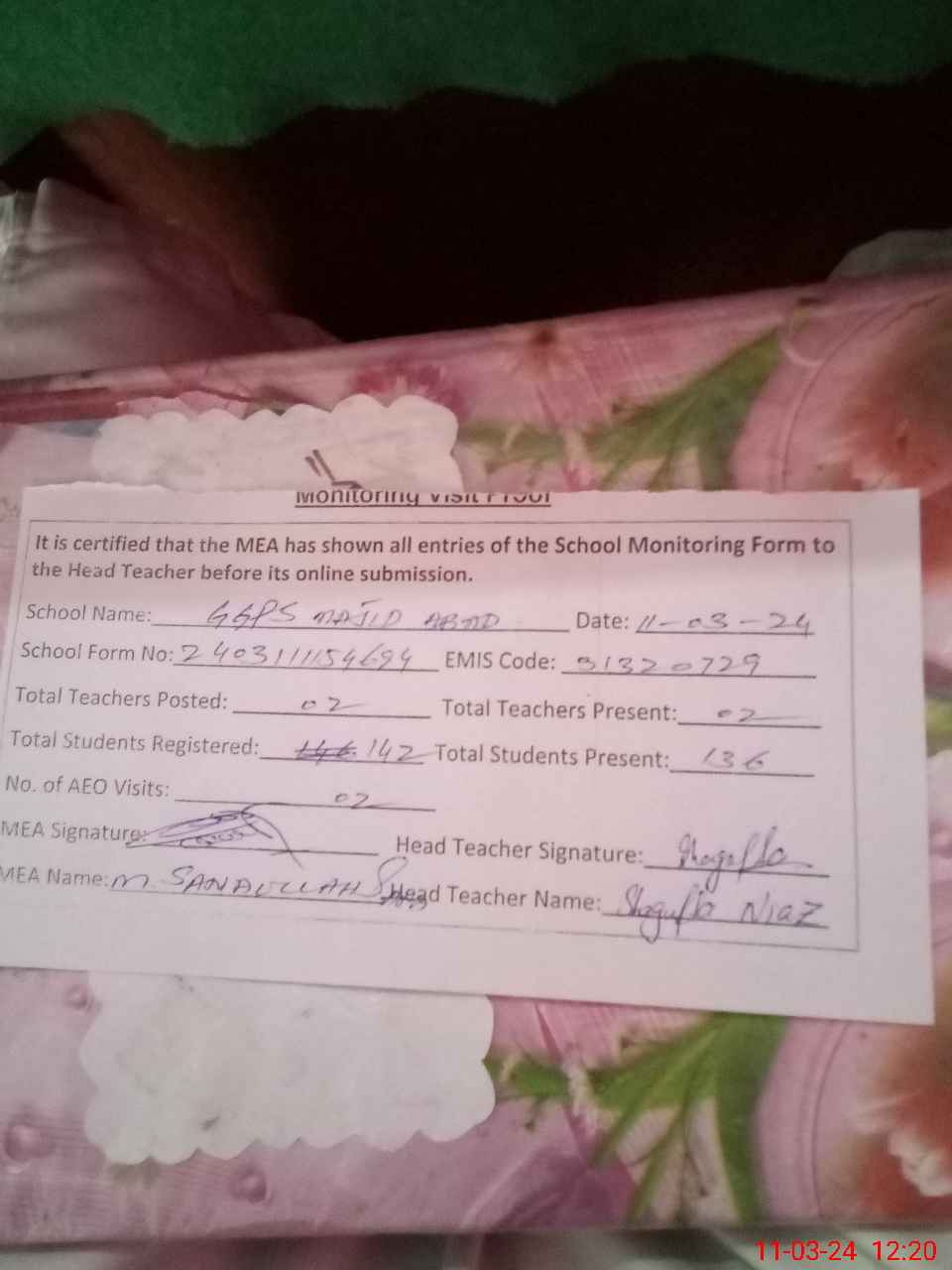 | Attendance Register | Head Teacher | MEA with School | Visit Proof |