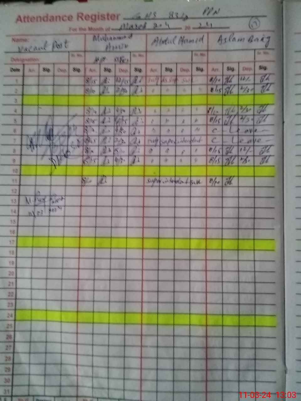 | CNIC | Full Name | Designation | R/C | Absence During Last Calender Month |
