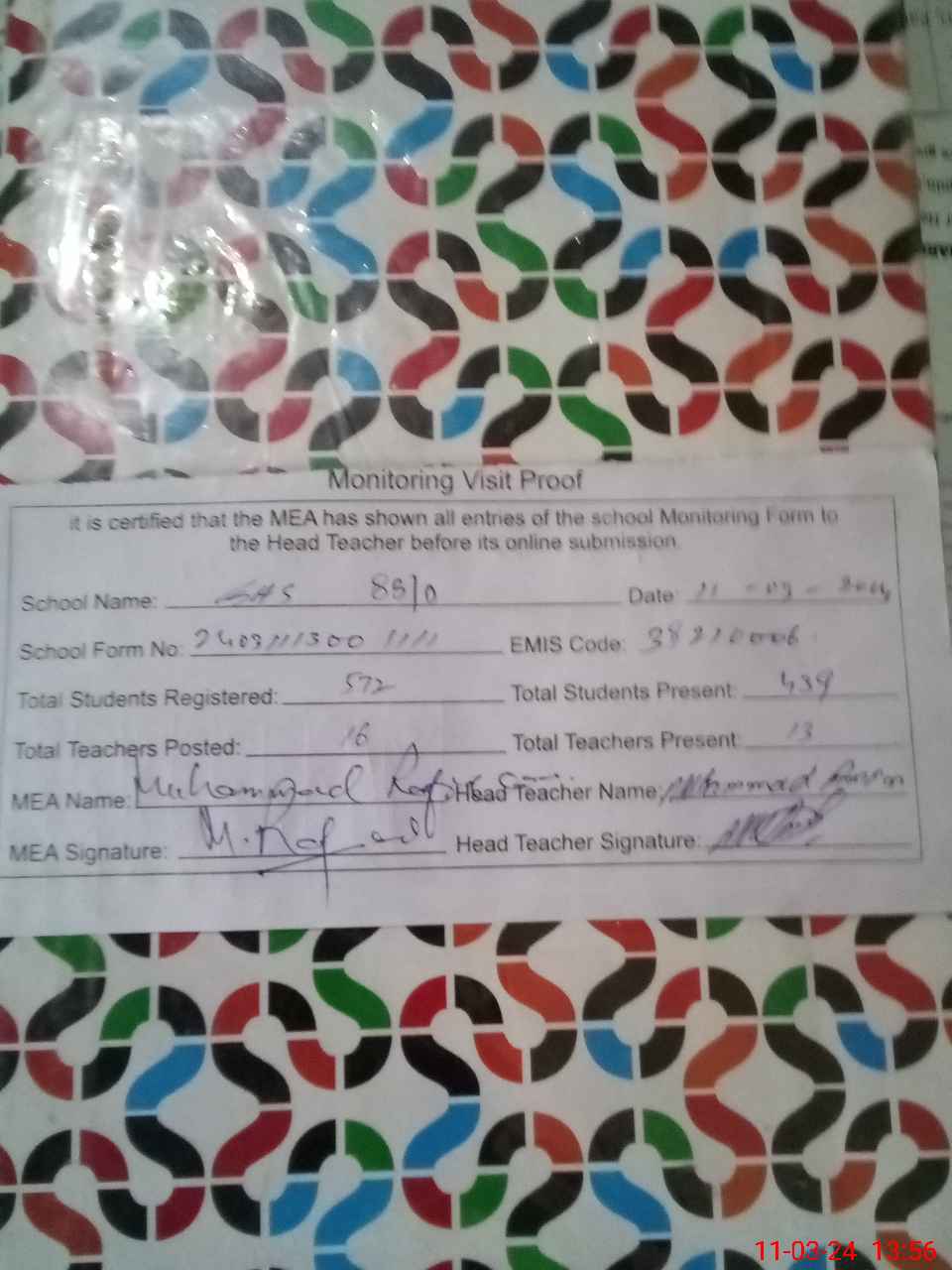 | Attendance Register | Head Teacher | MEA with School | Visit Proof |