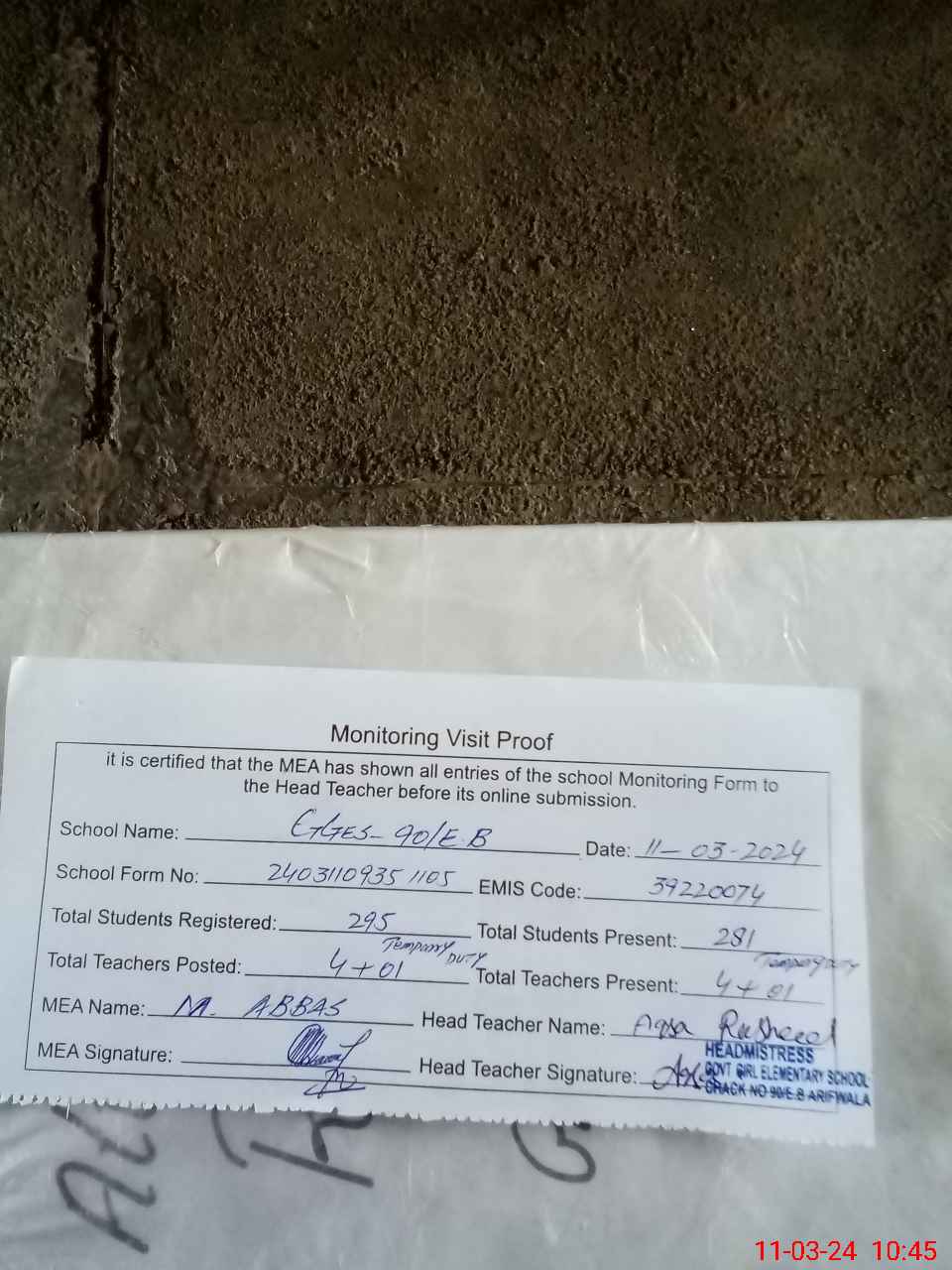 | Certified that this School was Inspected by the Undersigned MEA/DMO Today and the Information Stated Above is as Per Record. | |||||
