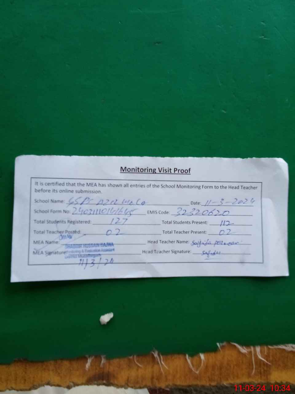 | Attendance Register | Head Teacher | MEA with School | Visit Proof |