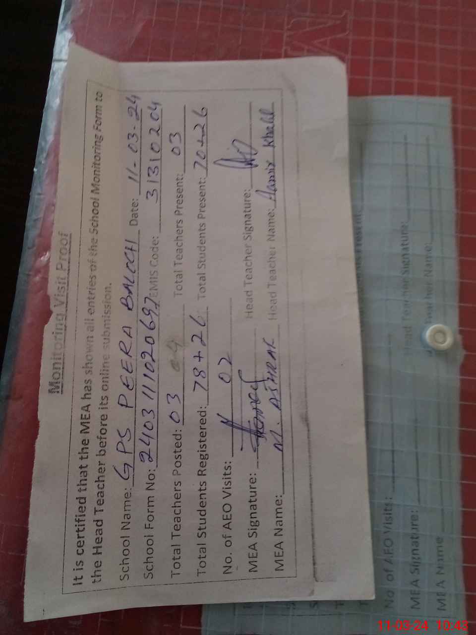 | Attendance Register | Head Teacher | MEA with School | Visit Proof |