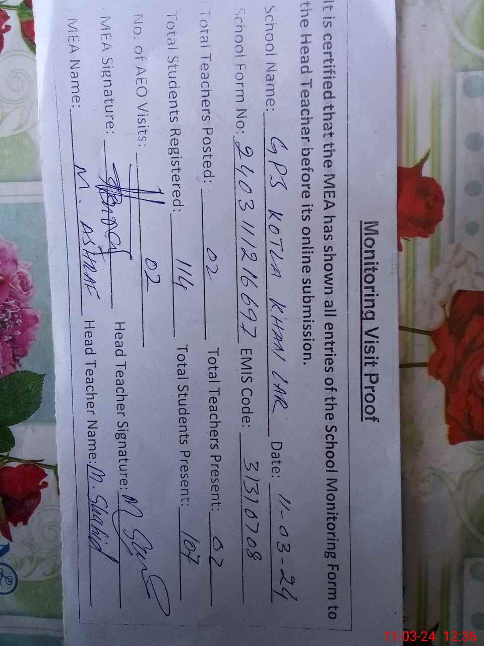 | Attendance Register | Head Teacher | MEA with School | Visit Proof |