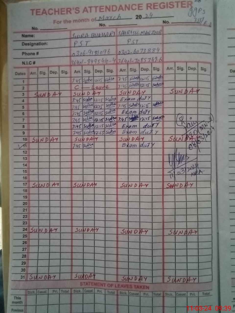| Name: SE**** MA**** Designation: (School Headmaster's/Headmistress's) PST Phone/Cell Number: 03**** |